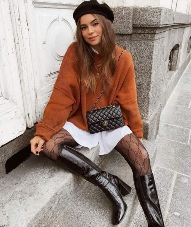Любите эксцентричные выходы в свет? Выбирайте теплые гольфины с шерстью. Это удлиненные гольфы, которые закрывают колени. Можно носить их в сочетании с тонкими телесными колготками.