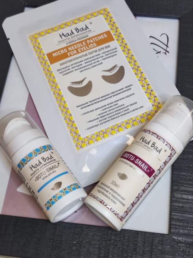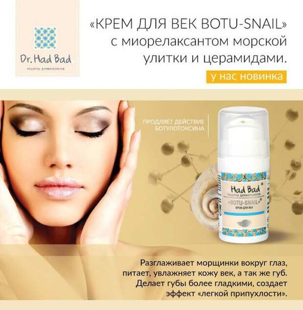 Линия Botu-snail Dr.HadBad представлена двумя средствами, содержащими миорелаксант морской улитки (conotoxin), который в комплексе с транспортным пептидом проникает в глубокие слои дермы и гиподермы. Они накапливаются в нервно-мышечных синапсах волокон, блокируют натрий-калиевые каналы, расслабляют вплетающиеся в кожу пучки поверхностно расположенной круговой мышцы глаза, благодаря чему она расправляется, мелкие морщины исчезают, а глубокие качественно уменьшаются.
