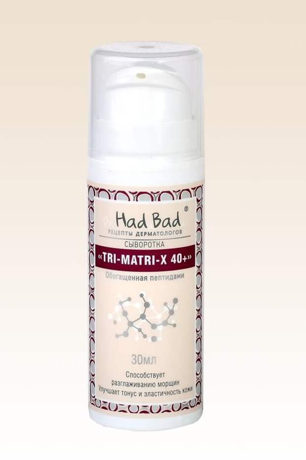 Увлажняющая сыворотка Tri-Matrix 40+ Dr.HadBad с двумя видами матриксилов, ретинолоподобным пептидом предназначена для ухода за увядающей кожей после 40 лет, она незаменима при желании повысить тонус и тургор кожи, разгладить поверхностные и уменьшить глубокие морщины, улучшить рельеф, уменьшить поры и сухость, замедлить и обратить вспять процессы гликации. Ее можно использовать и как домашнее уходовое средство, и под аппаратные процедуры.