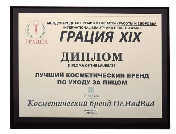 Бренд Dr.HadBad — обладатель премии «Грация» в номинации «Лучший косметический бренд по уходу за лицом» 2021 г. А также он вошёл в ТОП-10 лучших косметических брендов на рынке России по итогам Национальной премии «Моя косметика» в номинации «Альянс науки и красоты».