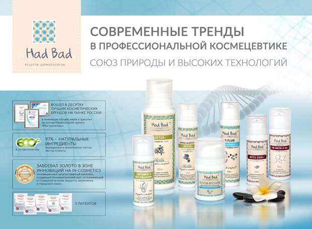 И, конечно, в ритме современной городской жизни вашей серьезной поддержкой станут средства российской биокосметики Dr.HadBad. Потому что это профессиональная косметика премиум-класса, объединившая новейшие достижения науки и опыт практикующих дерматологов. Она создана специально для решения проблем, характерных для жителей России и особенно ее крупных региональных центров.