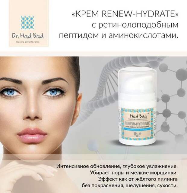 Знаковый продукт бренда Dr.HadBad – профессиональный Repair-cream Liquid crystals. Разработанное дерматологами для российского климата средство увлажняет кожу за счёт корнеотерапевтического действия, оно активно ее восстанавливает, быстро устраняет ее покраснение и шелушение.