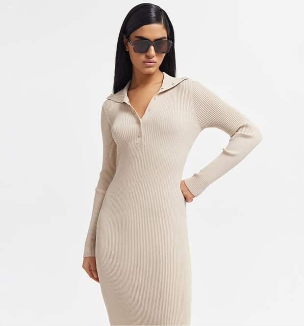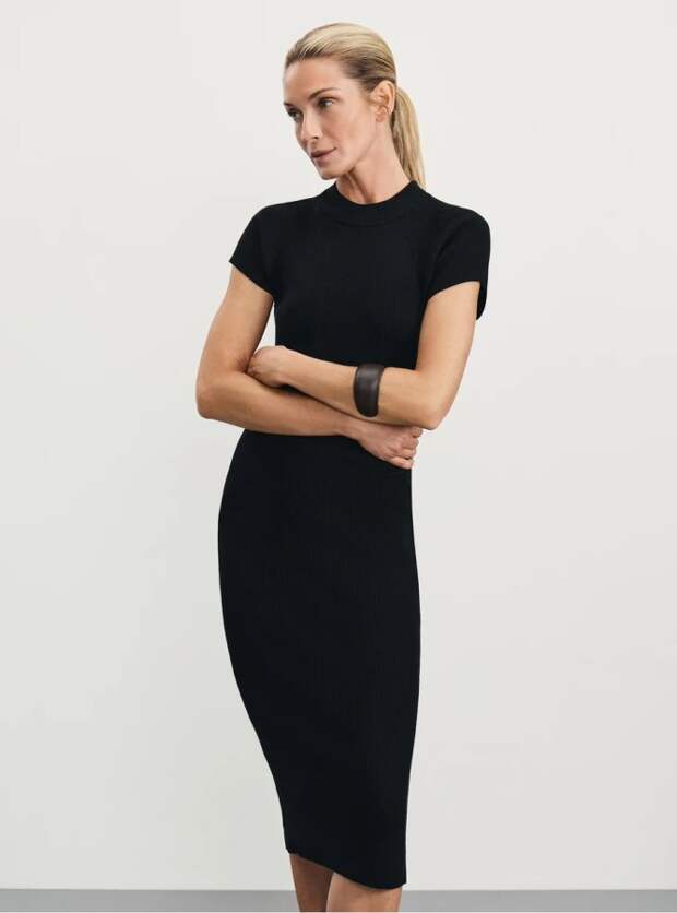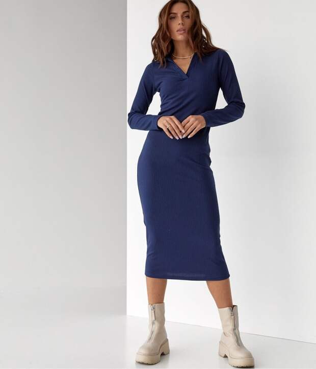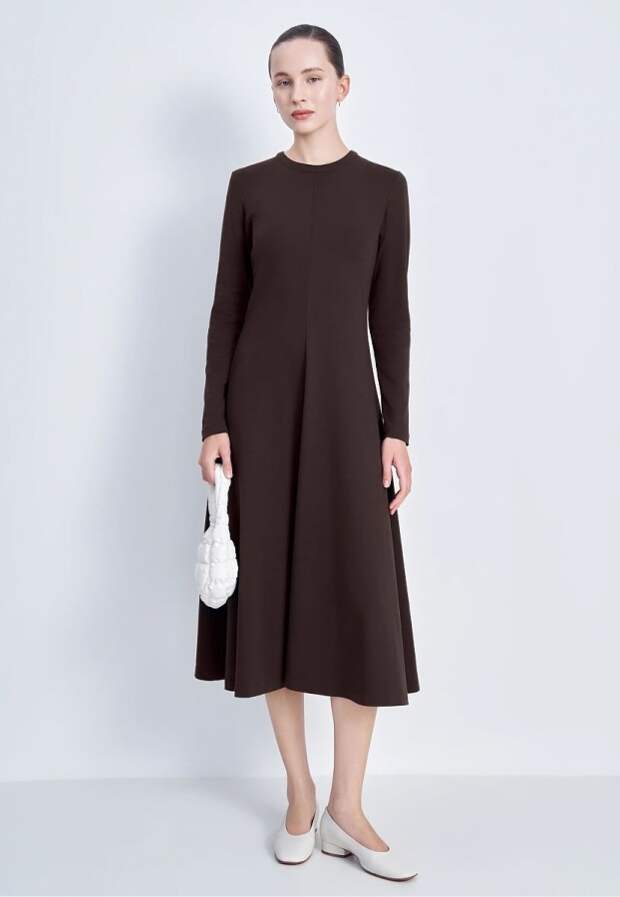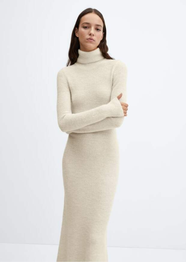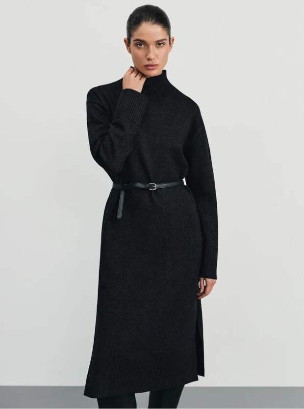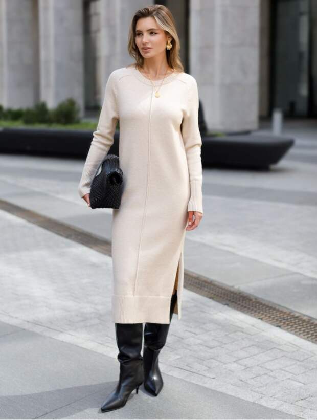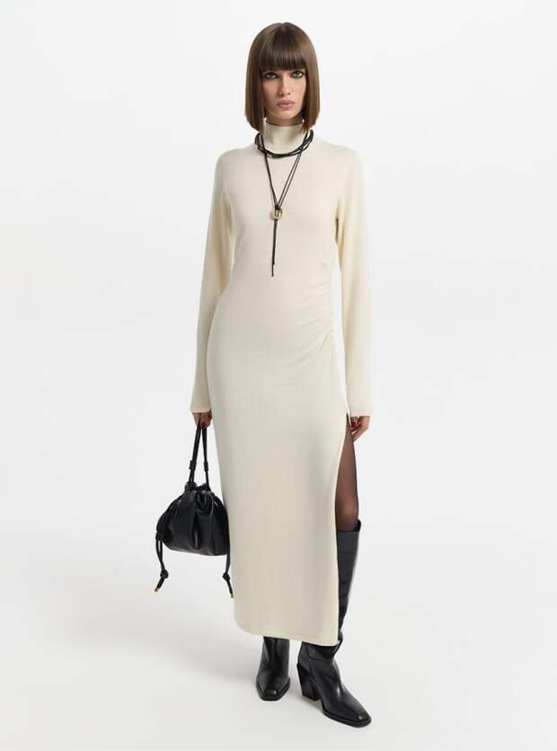 Круглый вырез и боковой разрез от середины бедра позволят комфортно передвигаться по городу и носить с платьем другие контрастные слои одежды.