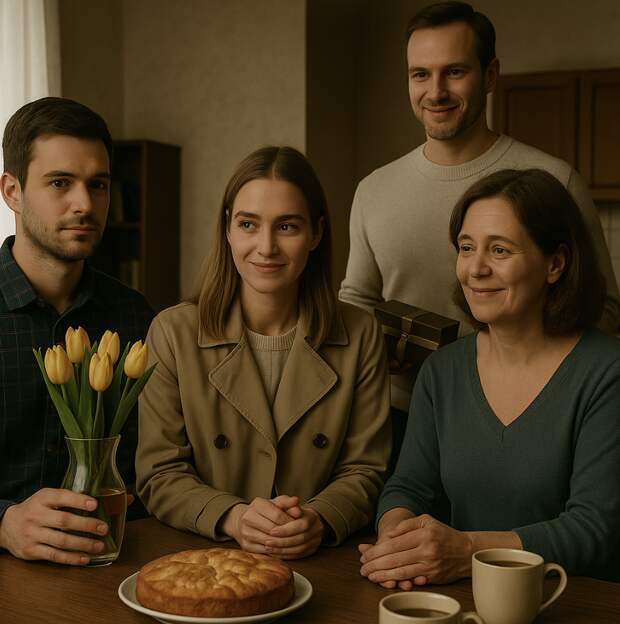 Через полчаса появилась Марина — в светлом плаще и с букетом ромашек. На лице — усталость после рабочей недели и лёгкая настороженность.