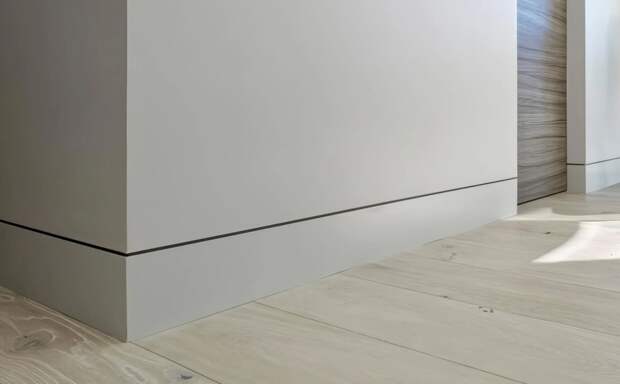 Аккуратный плинтус, подобранный по высоте и цвету к стене или полу, визуально «собирает» пространство. Например, если потолки низкие, то лучше выбирать невысокий плинтус в цвет стены, который визуально увеличит высоту помещения.