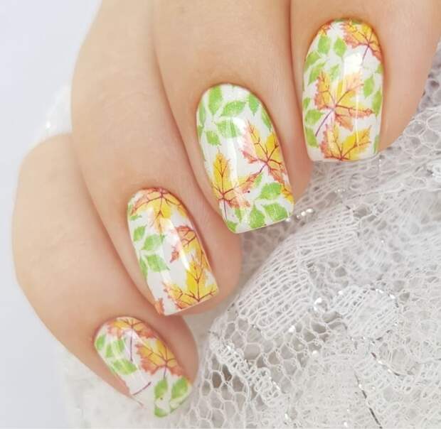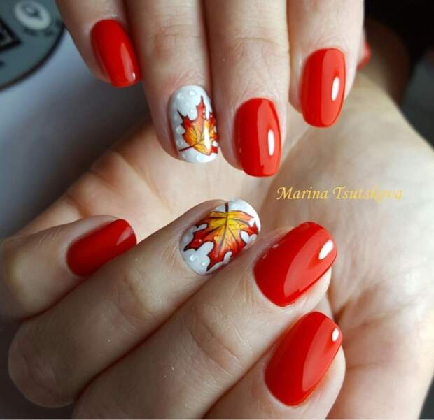 Принцип создания тот же, что и в геометрическом дизайне: соответствующая база и выразительные осенние цвета. Например, шик на бордовых матовых ногтях создают золотистые листья клена. Свежо и стильно – темные желуди на зеленых. Прекрасным украшением могут стать сезонные ягоды.
