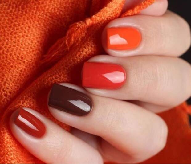 Настроение сезона отражают ногти в гамме заката. Искусный мастер соединит теплые и яркие оттенки красного, желтого, розового и фиолетового в цельный дизайн. Можно либо оставить так, либо украсить рисунками.