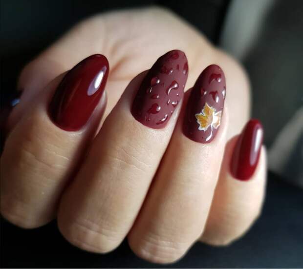 Однотонные, особенно матовые темные ногти очень элегантны, но если вам они кажутся скучными, то попробуйте добавить акценты. Осени подходит декор и узоры золотистого цвета: блестки, фольга, стемпинг и самостоятельные рисунки.