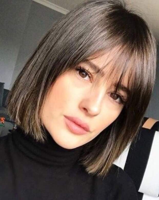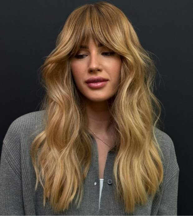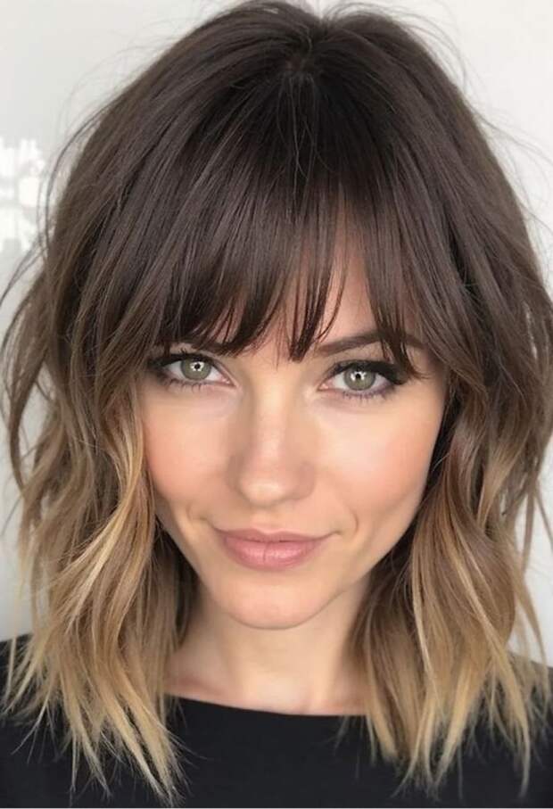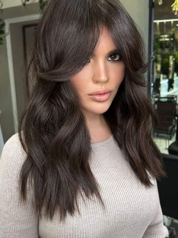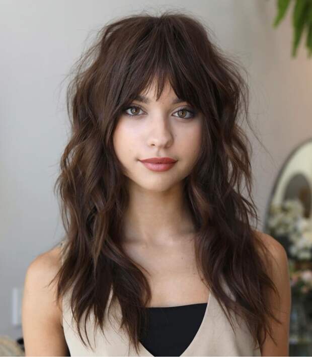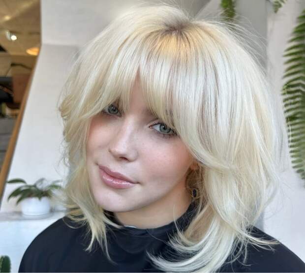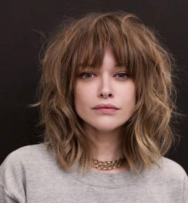 Такая челка прекрасно сочетается с многослойными стрижками, создавая образ расслабленного французского шика, напоминающий легендарную Брижит Бардо.