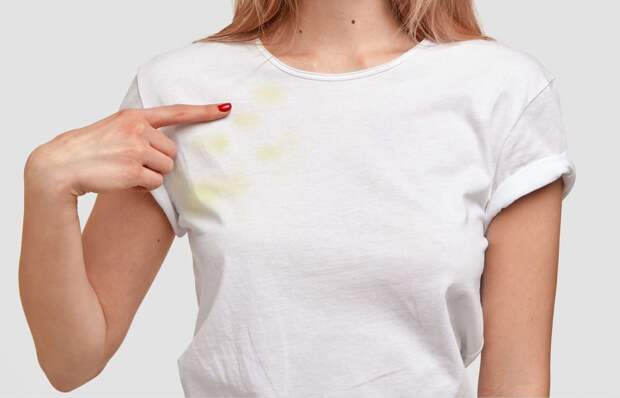 Один из виновников окрашивания — дезодоранты с солями алюминия. Они вступают в реакцию с потом, после чего образует трудновыводимые желтоватые пятна на светлой одежде и белые разводы на темной.