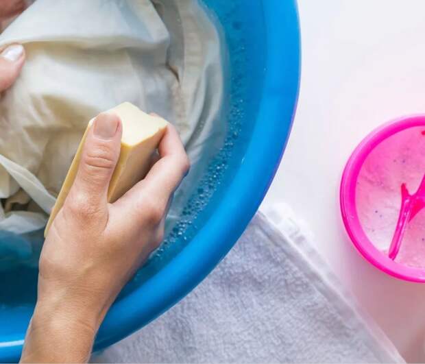 Классический и проверенный метод – натереть пятно хозяйственным мылом, оставить на 30 минут и затем постирать. Лучше использовать мыло с содержанием 72% жирных кислот – оно эффективнее.
