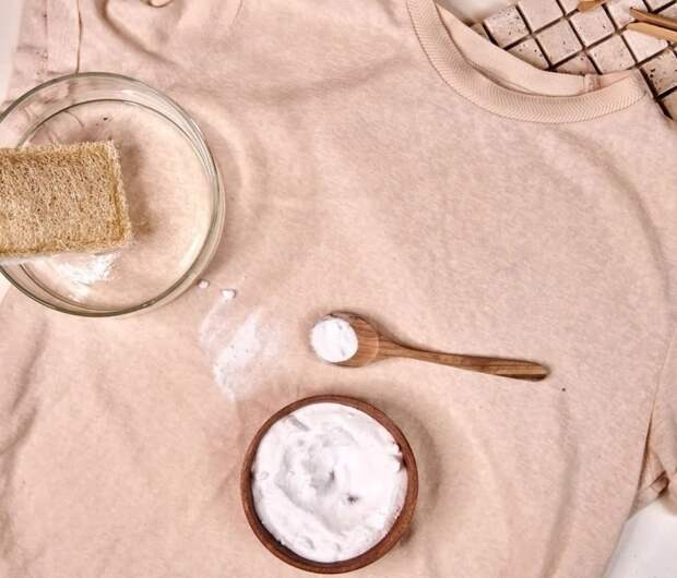 Она действует, как мягкий абразив, и удаляет запахи пота. Разведите 2-3 столовые ложки соды в небольшом количестве воды до состояния кашицы, нанесите на пятно, хорошенько потерев, и оставьте все на 1 час. После этого постирайте одежду.