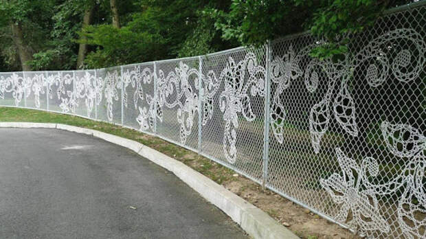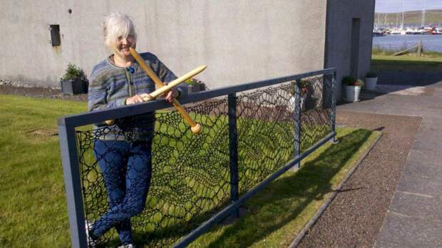 Женщина вяжет уникальные кружевные полотна, которые крепятся к стойкам и выглядят ка настоящий забор.