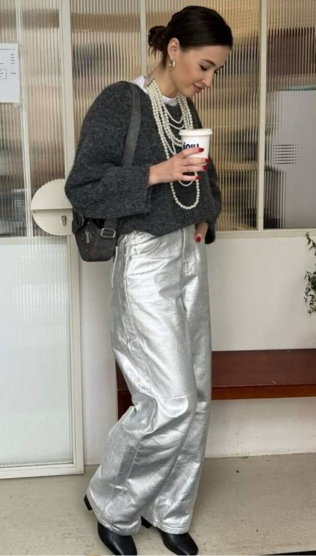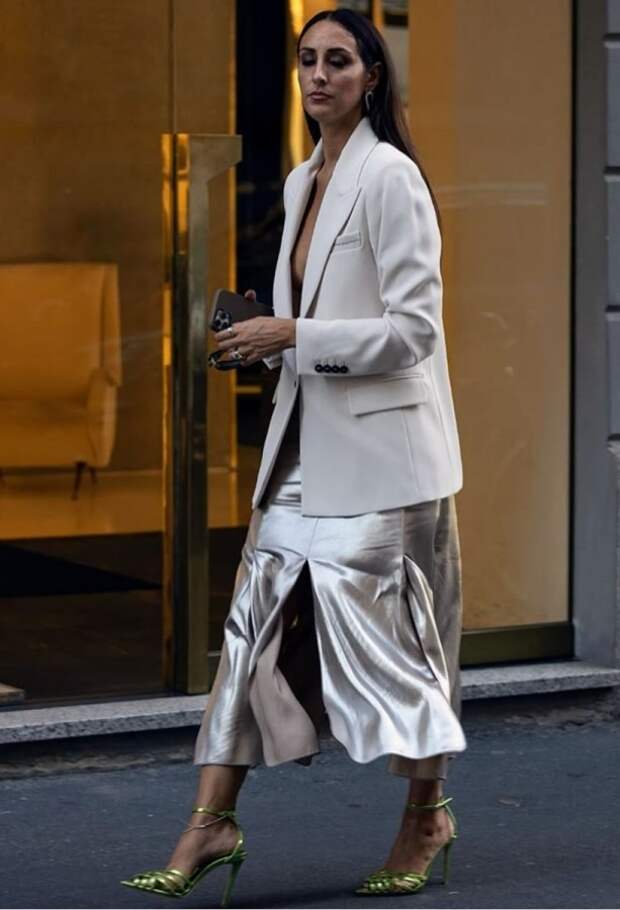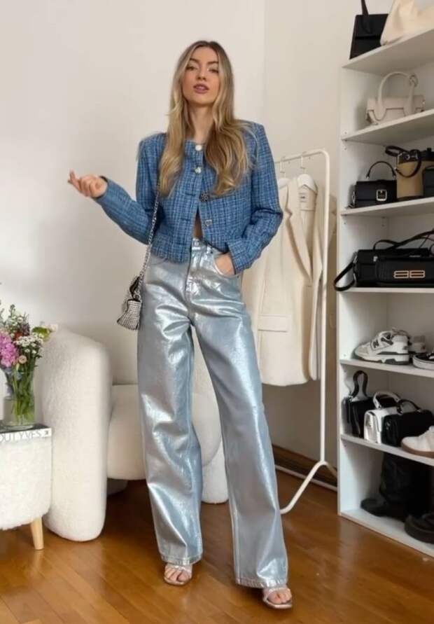 Важно помнить о балансе: металлик сочетается с базовыми нейтральными тонами (черный, белый, бежевый) и с яркими акцентами. В дневных образах носите вещи с эффектом металлик дозировано, ограничиваясь 1-2 предметами, а для вечернего мероприятия можно выбрать и смелые комбинации.