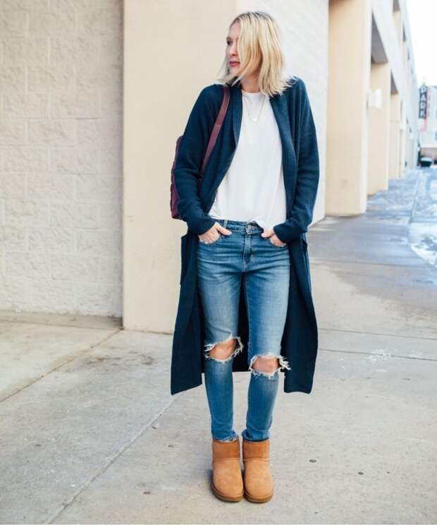 Объемные свитера или длинные кардиганы в сочетании с леггинсами и UGG — кэжуал-образ на каждый день. Такой стильный наряд даст максимальный комфорт. Вы можете надеть их с джоггерами и спортивной курткой, теплыми леггинсами и длинным пуховиком, стильным худи и рюкзаком. Угги добавят легкости и завершенности образу